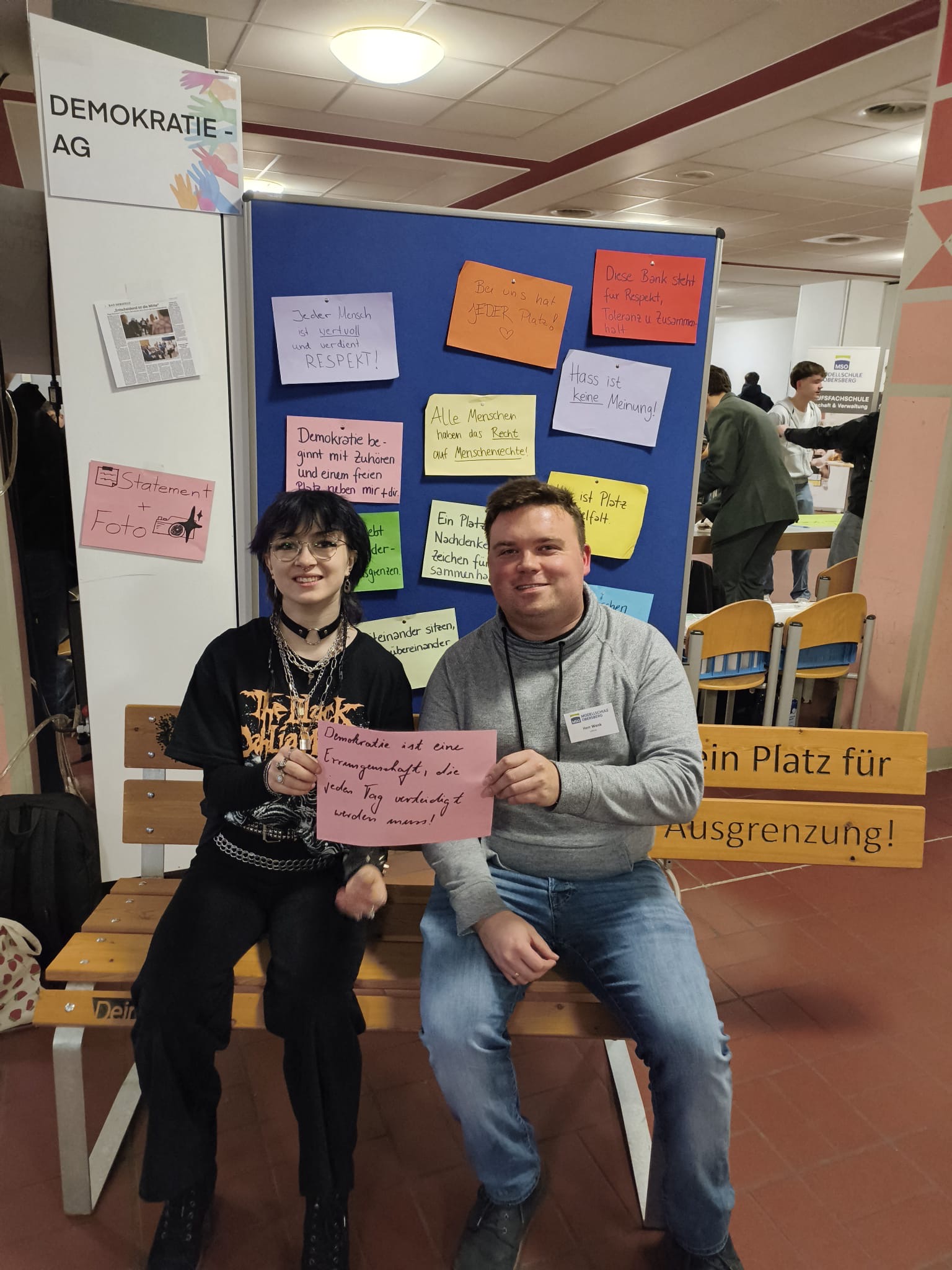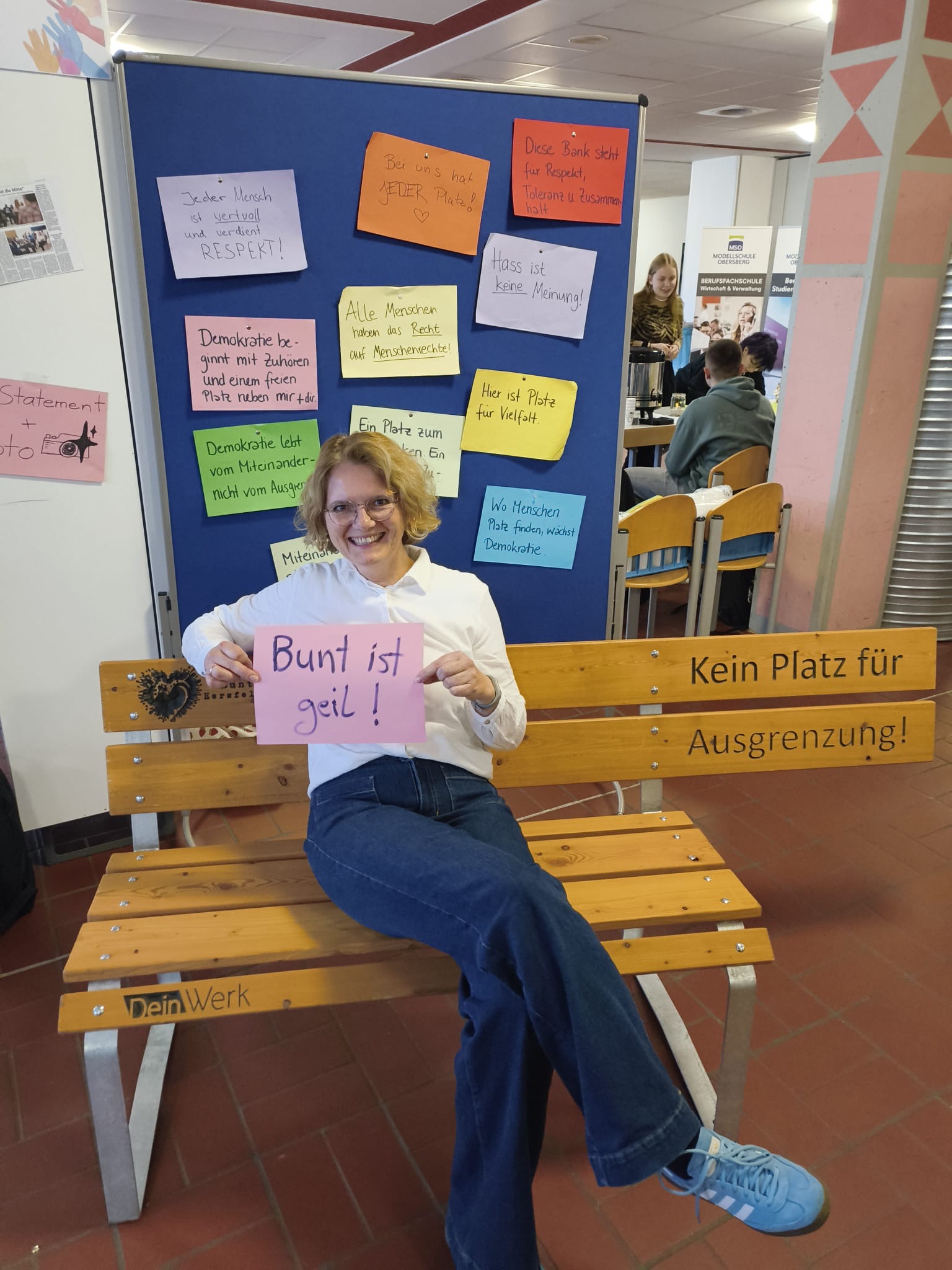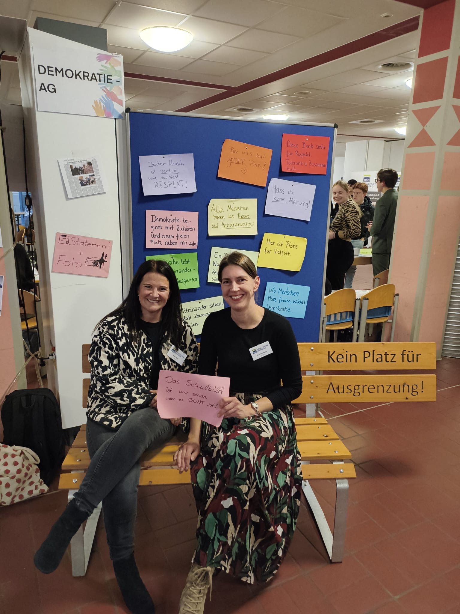 Um die Botschaft der Bank zu betonen, hatte die Demokratie-AG bunte Blätter mit weiteren Statements vorbereitet. Auch am darauffolgenden Tag wurde die Bank ausgiebig am Tag der offenen Tür der MSO als Fotokulisse genutzt. Zahlreiche Menschen setzten sich in der Pausenhalle auf die Bank gegen Ausgrenzung. Mit Sprüchen wie „Wir l(i)eben bunt!“, „Kein Platz für Ausgrenzung. Viel Platz für Menschlichkeit“, „Kein uns ohne wir“ oder auch „Hass ist keine Meinung!“ setzten sie ein Zeichen für Vielfalt und Toleranz sowie Diversität in der Schule.