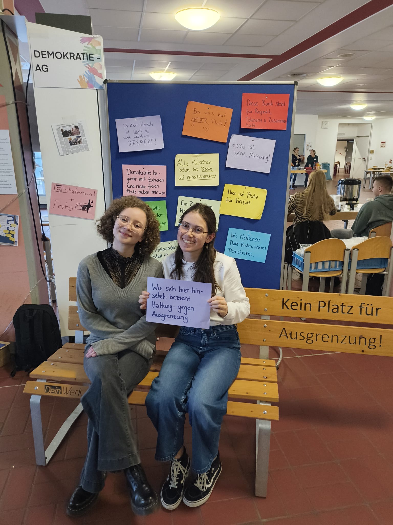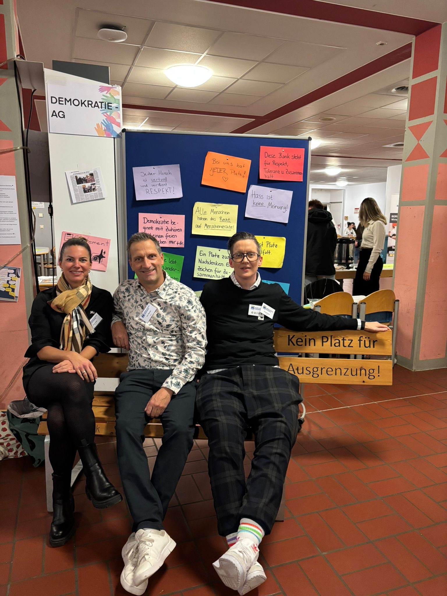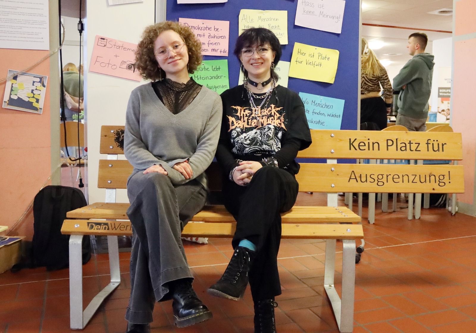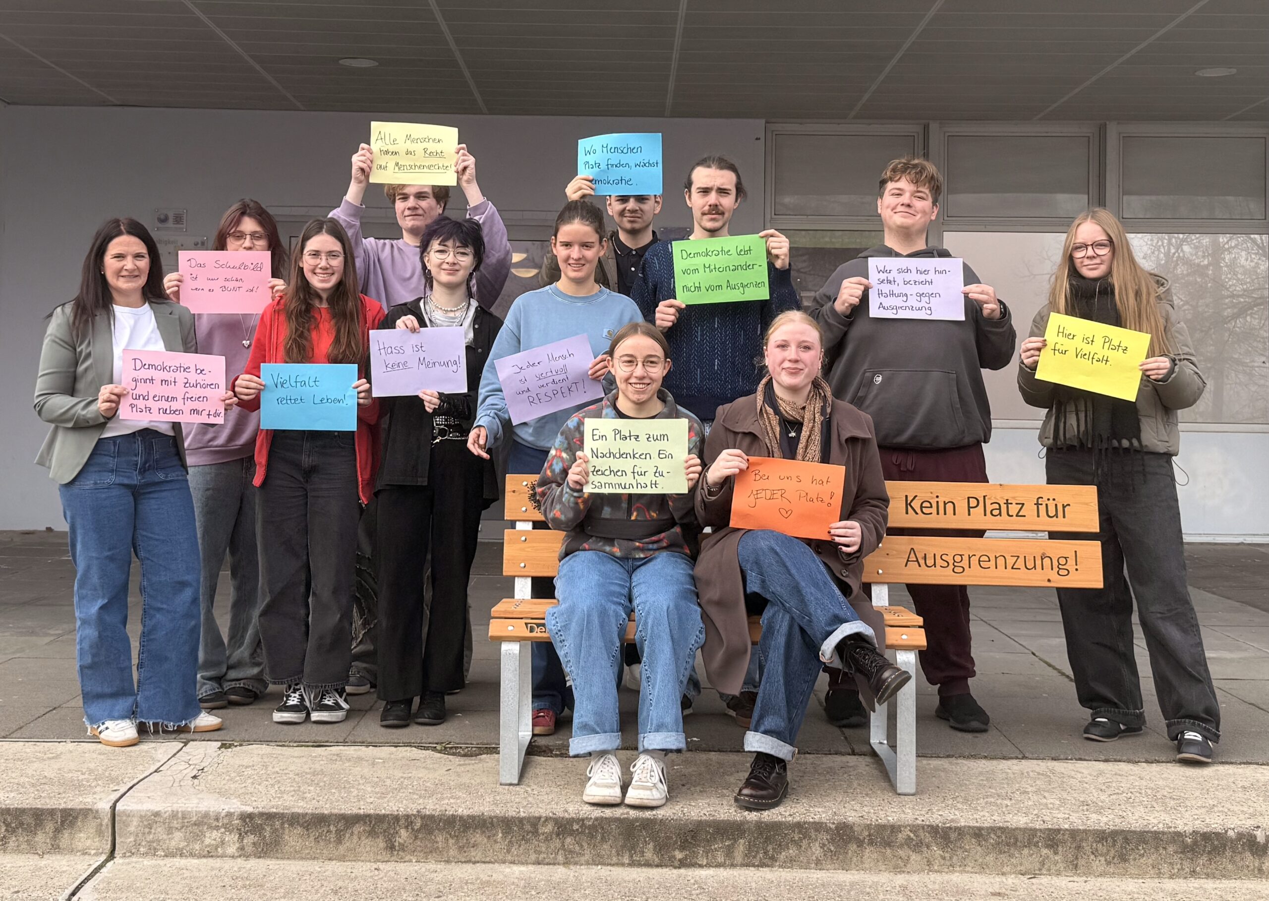 Um die Botschaft der Bank zu betonen, hatte die Demokratie-AG bunte Blätter mit weiteren Statements vorbereitet. Auch am darauffolgenden Tag wurde die Bank ausgiebig am Tag der offenen Tür der MSO als Fotokulisse genutzt. Zahlreiche Menschen setzten sich in der Pausenhalle auf die Bank gegen Ausgrenzung. Mit Sprüchen wie „Wir l(i)eben bunt!“, „Kein Platz für Ausgrenzung. Viel Platz für Menschlichkeit“, „Kein uns ohne wir“ oder auch „Hass ist keine Meinung!“ setzten sie ein Zeichen für Vielfalt und Toleranz sowie Diversität in der Schule.
