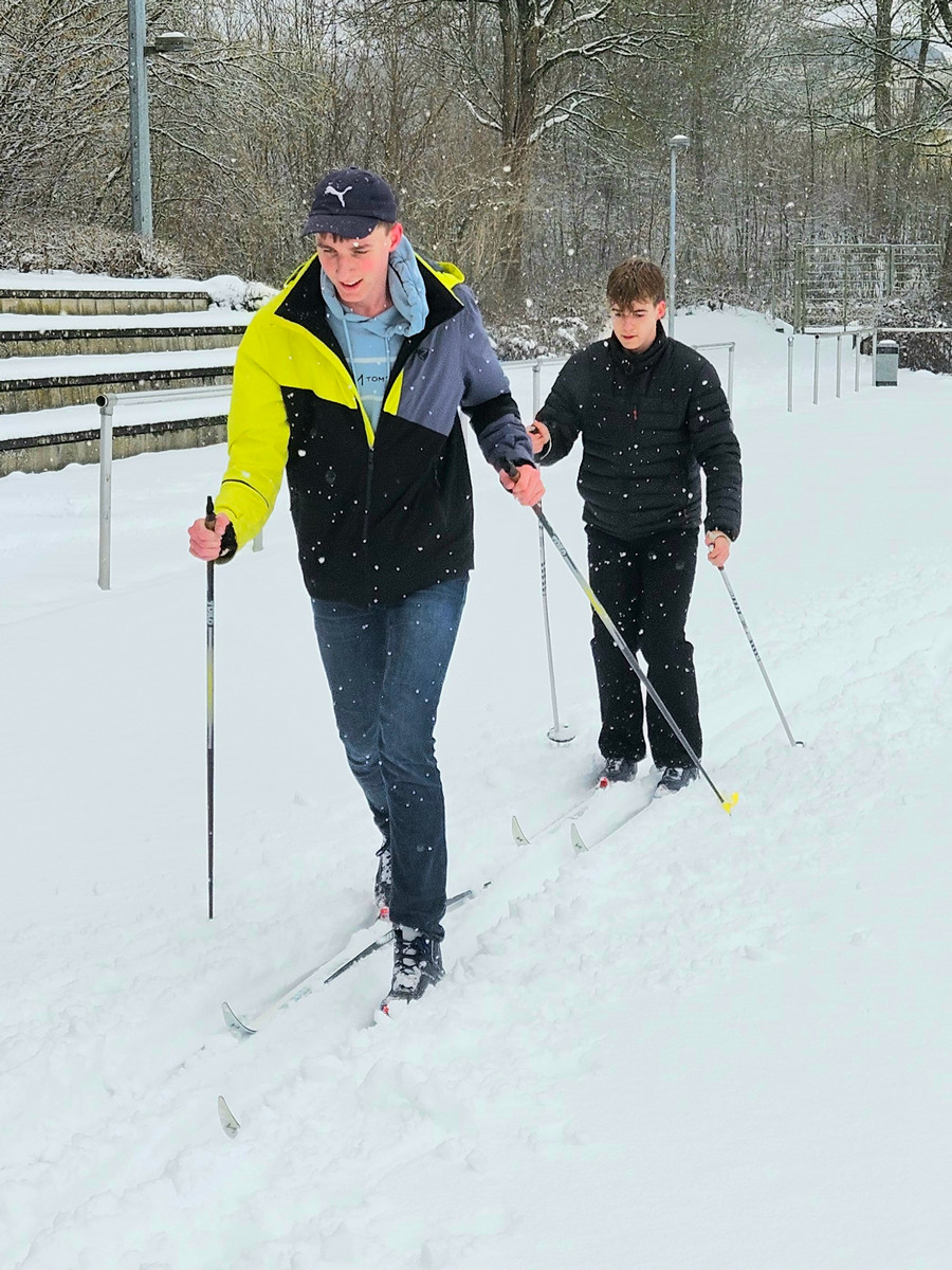 … und manchmal kommt auch etwas Gutes dabei heraus. Angesichts immer knapper werdender Kapazitäten an Sportstätten hat die MSO in diesem Schuljahr einen „Sport ohne Halle“-Sportkurs eingerichtet. Zur Unterrichtszeit steht kein Sporthallenteil zur Verfügung und so sind wir entweder bei jedem Wetter und zu jeder Jahreszeit draußen oder verlegen den Unterricht auf Lehrgangssportarten, die ohnehin nicht in der Schule durchgeführt werden können. Im ersten Halbjahr des Schuljahres haben mehr als 90% der Schülerinnen und Schüler des Kurses schon ihr Deutsches Sportabzeichen abgelegt, im DAV-Kletterzentrum in Fulda den Toprope-Schein fürs Hallenklettern erworben und die Eisfläche im Eislaufstadion in Kassel unsicher gemacht. Heute haben wir das Wetter genutzt und waren mal mit Langlaufski im Stadion unterwegs.